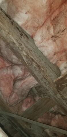 You can also see that the pink insulation is moist, dirty, and falling from the ceiling. This does not help the wood, because the moist insulation is clinging to the wood.