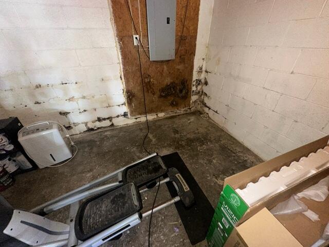 This photo shows that there are some wet spots from water seeping out of the concrete block walls onto the edges of the floor as well as the doorway where water is intruding.