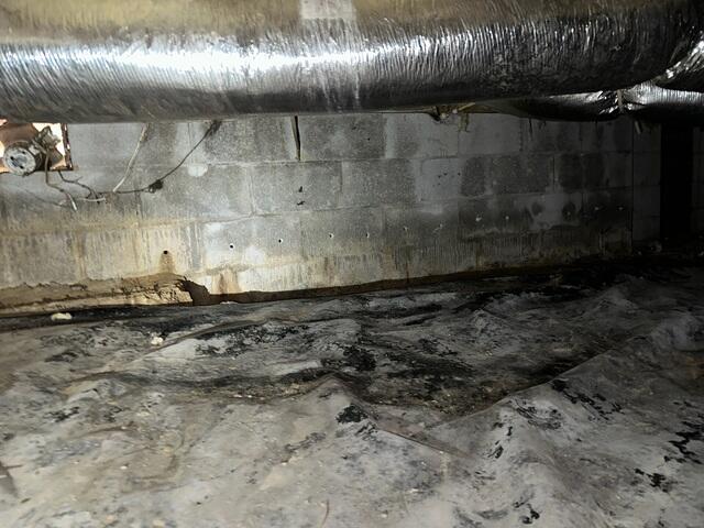 Moisture damage is visible in this crawl space. From water lines on the concrete block wall to the mud on the old vapor barrier.